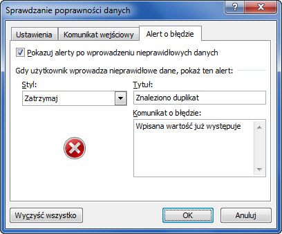 • na karcie Alert o błędzie określić komunikat, jaki zostanie wyświetlony w chwili gdy do komórki zostanie wprowadzona zawartość, która już istnieje w innej komórce: