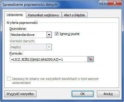 • np. dla zakresu komórek A2:A200 należy wpisać: =LICZ.JEŻELI($A$2:$A$200;A2)=1