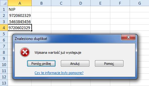 Od tej chwili, gdy do komórki zostanie wpisana zawartość, która występuje w innych komórkach, zostanie wyświetlony komunikat, a wpisanie drugi raz tego samego będzie niemożliwe.