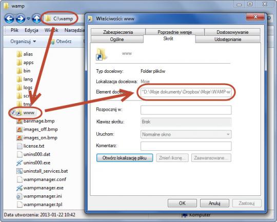 Polecenie mklink utworzy w folderze źródłowym C:\WAMP łącze symboliczne o nazwie WWW do folderu docelowego D:\Moje dokumenty\DropBox\WAMP-WWW.