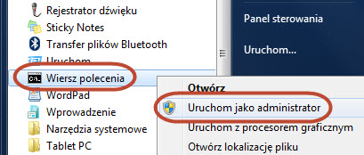 • z menu Start uruchomić z uprawnieniami Administratora narzędzie Wiersz polecenia (należy wybrać je prawym przyciskiem myszy i wybrać Uruchom jako Administrator)