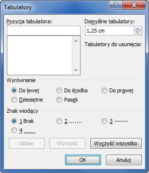 Tylko w tym oknie można ustawić tzw. znaki wiodące tabulatorów. Oprócz tego, można ustawić pozycję i wyrównanie, jednak te czynności można wykonać również korzystając z linijki.